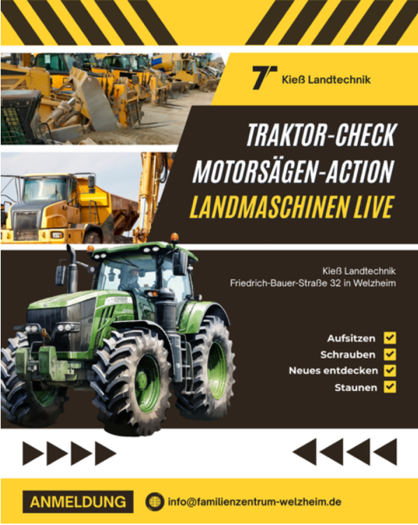 Große Maschinen hautnah erleben – sei dabei! Kieß Landtechnik lässt dich im Traktor Platz nehmen und die Aussicht genießen 😮. Schau hinter die Kulissen einer Werkstatt und erlebe, wie eine Motorsäge in ihre Einzelteile zerlegt wird. So geht Berufe schnuppern in Welzheim – Staunen und Neues lernen. Alter: 11-14 Jahre, Dienstag, 28.10.25 von 09:30 – 11:30 bei Landtechnik Kieß vor Ort, kostenlos, Anmeldung: info@familienzentrum-welzheim.de