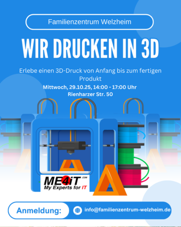 Neugierig geworden? Dann schau vorbei – der Welzheimer IT- und 3D-Druck Spezialist Jürgen Kuhn wirft den 3D-Drucker an und druckt ein… – das verraten wir noch nicht – komm selbst und sieh…😊 Alter: 11-14 Jahre, kostenlos, Anmeldung: info@familienzentrum-welzheim.de